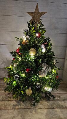 Decorate your home with a fresh cut boxwood tree. We can customize them for your specific color scheme. Just call us for details. This is not a rooted plant. Stands approx. 22".